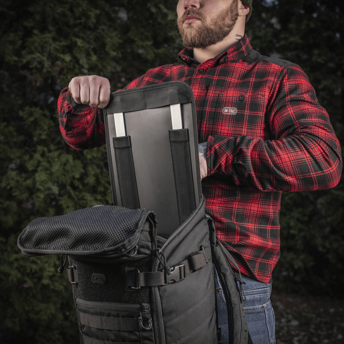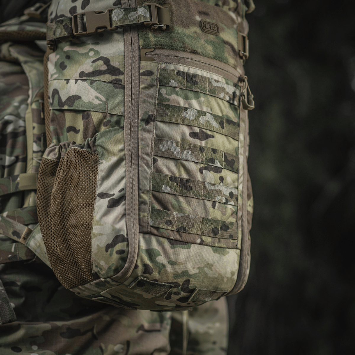M-Tac Gen.II Elite Small Backpack åbnes som en kuffert, hvilket gør pakning nem og praktisk. Siderne har mesh-lommer med elastiske snore samt sidelommer med elastikremme dækket af klapper, som holder indholdet sikkert.